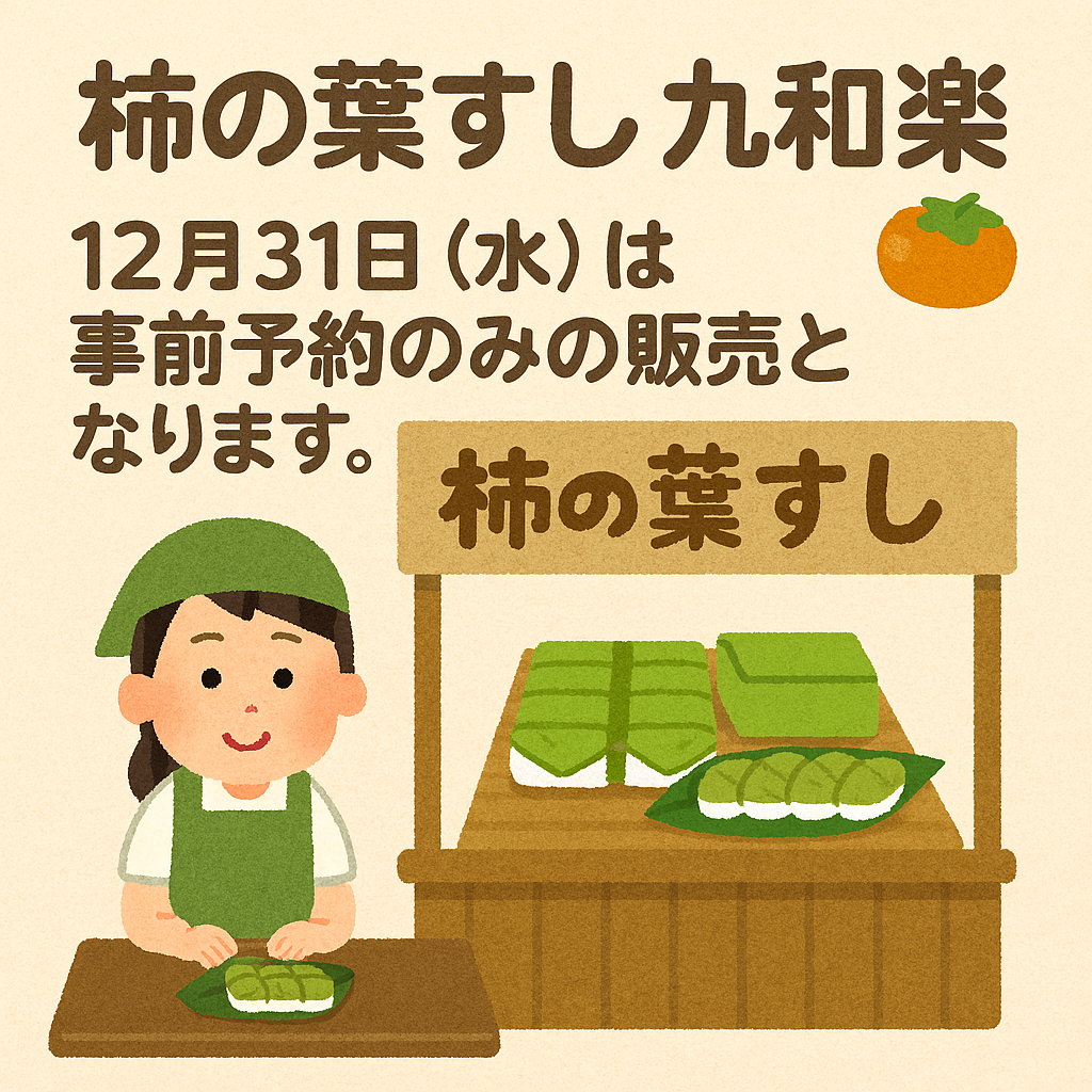 令和7年 12月末の営業について ご連絡 2025.12.26 ◯12月29日(月)は臨時営業 ◯12月30日(火)は臨時休業(年末最終発送分の柿の葉すしで精一杯ですので、臨時休業とさせて頂きます) ◯12月31日(水)は午前中で営業終了となります。 ※12月31日(水)は事前予約分のみの販売となりますので、ご予約宜しくお願い致します。