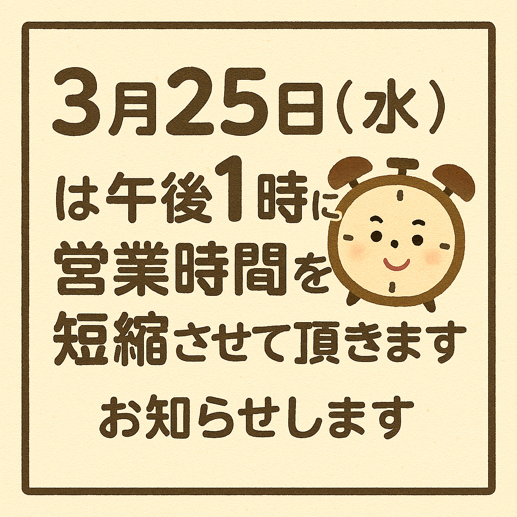 3月25日(水)は午後1時と営業時間を短縮させて頂きます。