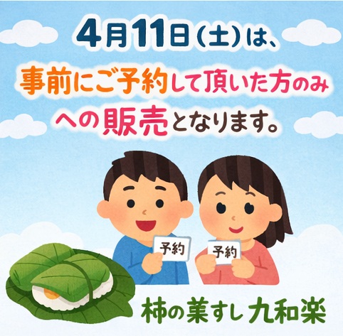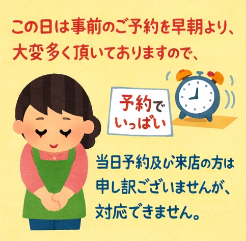 4月11日(土)の販売対応について 未分類 2026.04.07 4月11日(土)は、事前にご予約して頂いた方のみへの販売となります。 この日は事前のご予約を早朝より、大変多く頂いておりますので、 ○当日(4月11日(土))ご予約の当日お持ち帰りの方 ○当日(4月11日(土))ご来店の方は、 申し訳ございませんが、対応できません。 前日の4月10日(金)の午後2時(営業時間内)までに事前予約をお願いいたします。