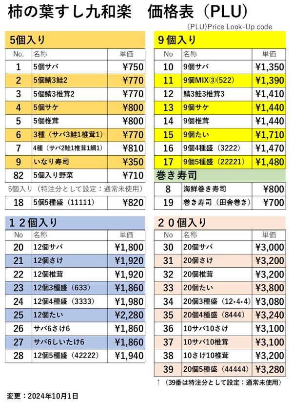 価格表の詳細(九和楽使用レジのバージョン)を紹介いたします。