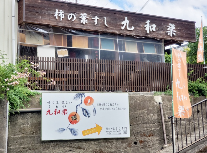 南海高野線の九度山駅より西へ、時間に追われる方は、惟ひたすら黙々と、ゆとりのある方はぶらりぶらりと、途中500mの所に『柿の葉すし 九和楽』があります。600mには真田庵(真田幸村親子をお祀りしているお寺善名称院)があります。